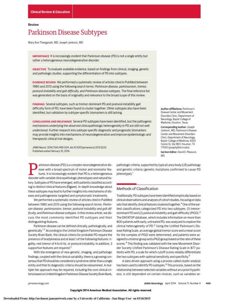 Parkinsons disease has three subtypes of motor symptoms. Despite the lack of other disabling motor symptoms the tremor of tremor-predominant Parkinsons disease can be very disabling especially if a postural and kinetic component exists. Tremor-predominant Parkinsons disease is characterised by prominent tremor of one or more limbs with a relative lack of significant.