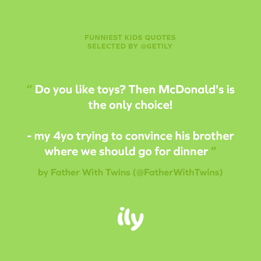 Funny things kids say quotes. Due to the overwhelming number of submitted posts Alyssa and Greg Dunbar digital marketing manager at the Walt Disney Studios decided to create a book featuring the funniest and craziest kids quotes. Funny things kids say. And Ellis continues to share their quotes.